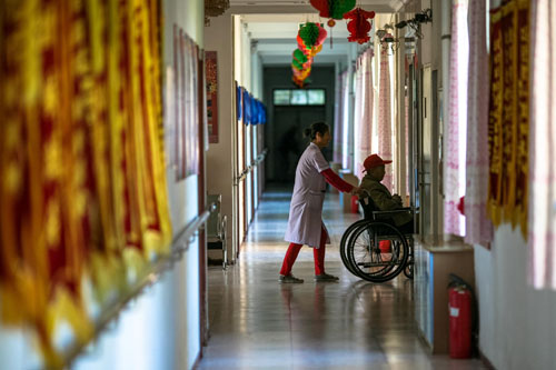 在一家敬老院,一名護理員用輪椅推著一名老人上電梯(2013年10月3日攝)。新華社發(fā) 來源:參考消息網(wǎng) 圖片來自網(wǎng)絡(luò) |